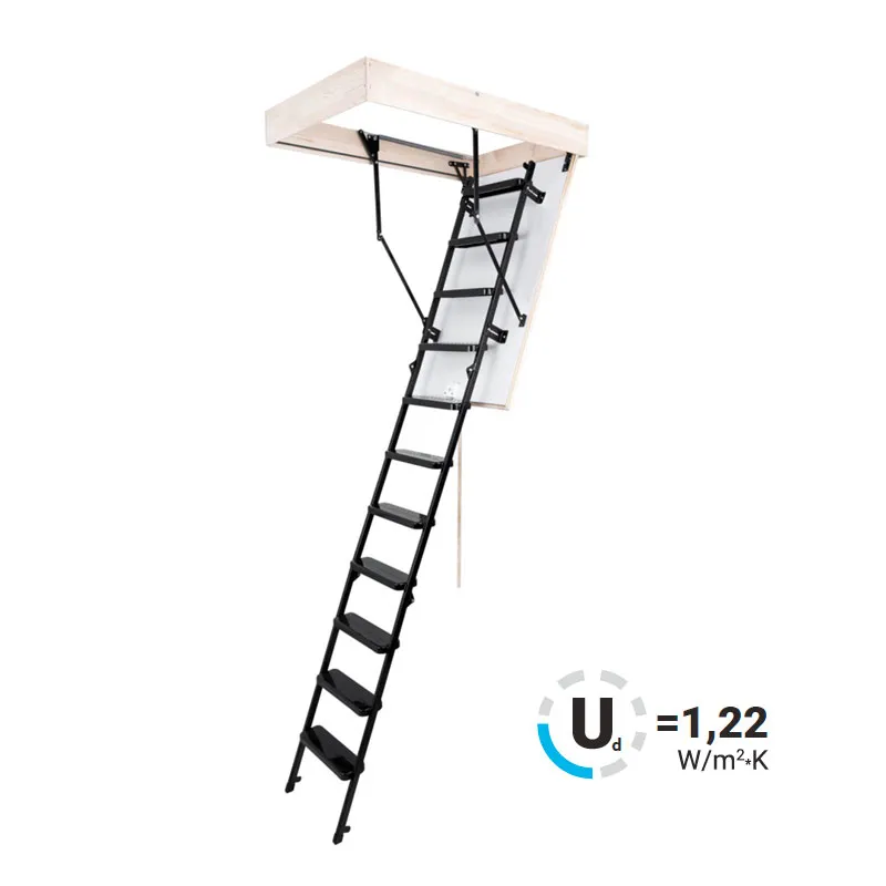 Металлическая чердачная лестница LST оснащена энергосберегающей термоизоляционной крышкой люка белого цвета. По периметру люка установлен контур уплотнения, обеспечивающий высокую степень герметичности. Благодаря «ножничной» системе складывания в сложенном виде лестница очень компактна и имеет небольшой размер крышки люка. S-образные боковые элементы лестницы выполняют роль поручней и придают лестнице современный вид.