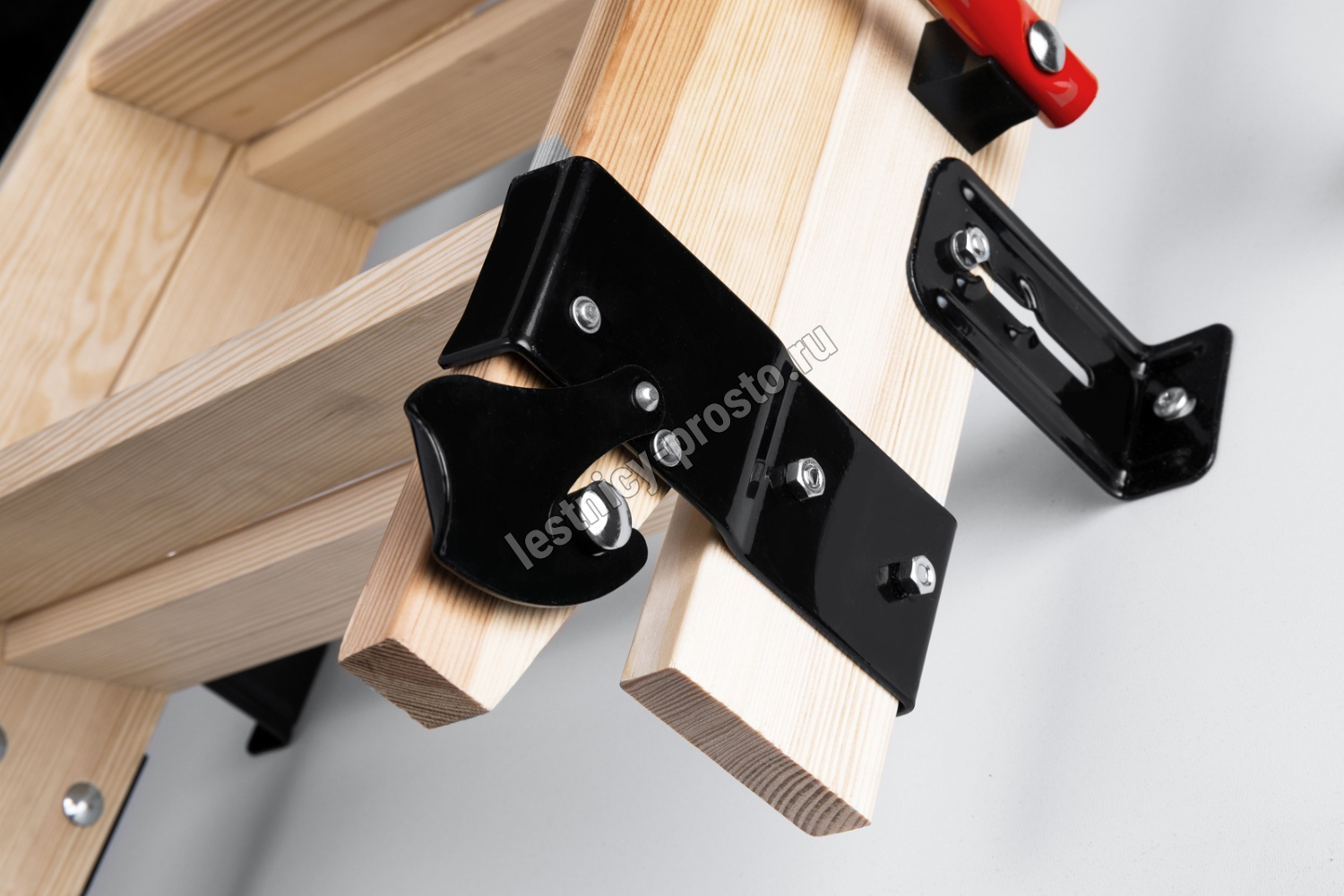 Лестница раздвижная двухсекционная, изготовлена из сосны. Термоизоляционная крышка типа "сэндвич" имеет усиленную теплозащиту, облицована с двух сторон ДСП белого цвета. По контуру короба имеется уплотнитель. Все металлические элементы лестницы покрыты порошковой краской, ступени лестницы имеют антискользящие насечки и закреплены в столярное соединение «ласточкин хвост», что позволяет выдерживать нагрузку 150 кг. При раскладывании лестницы нет вылета за пределы короба, что позволяет использовать эту модель лестницы в таких помещениях, где невозможно использовать чердачные лестницы с большим разбегом открытия. Удобна для эксплуатации на большой высоте. Деревянный стержень для открывания лестницы в комплекте..