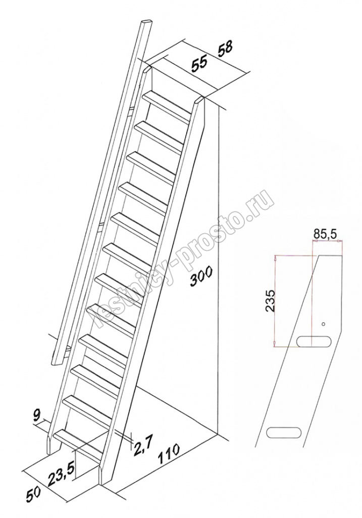 Толщина ступеней: 27 мм (врезные, закругленные)