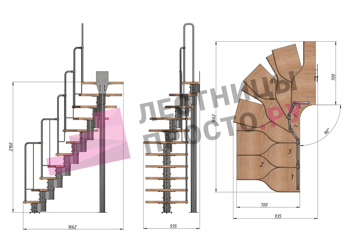 Лестница Prosto Urban Black гусиный шаг 700 мм, h198-288 см (11 ступеней), дуб